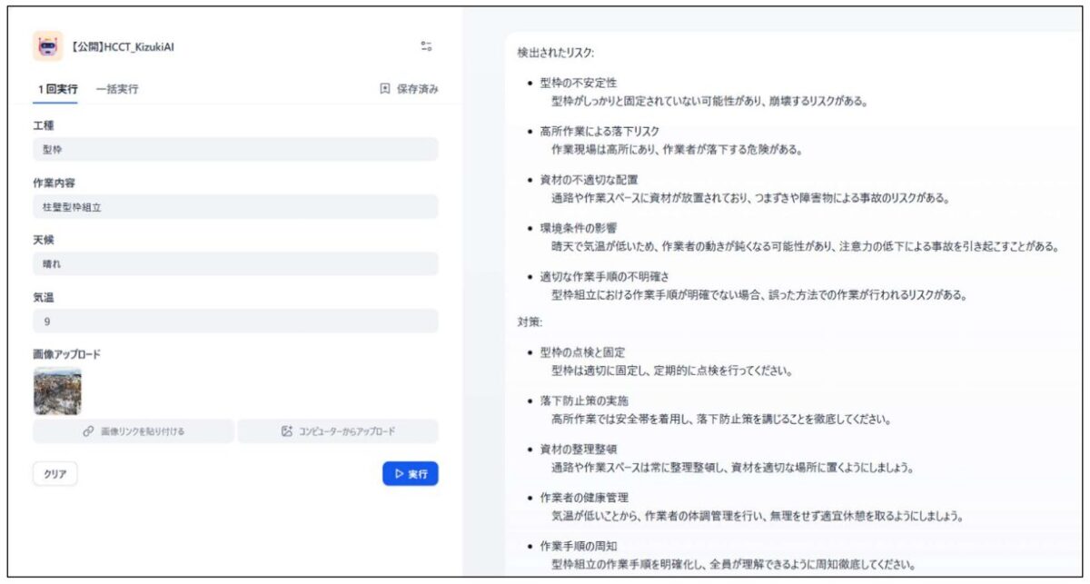 Kizuki AI(キヅキアイ)では、パソコンやスマートフォンに工種、作業内容、天候、気温を入力し、作業現場の写真をアップロードするだけで、生成AIが熱中症や足場の不安定性など想定されるリスクと対策を具体的に提示するため、施工管理者に気づきを与えることが可能になる。ここに至る試行段階では、過去の災害事例の写真を基にプロンプト(生成AIへの指示)を調整し、検出されるリスクの精度向上を図ってきた。合わせて若手の施工管理者とKizuki AI(キヅキアイ)のそれぞれがリストアップしたリスクを比較したところ、若手の施工管理者に新たな気付きを与える効果を確認した。