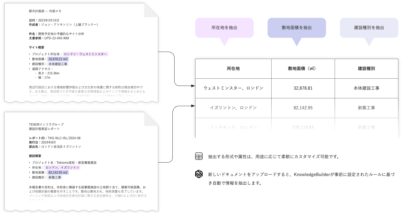 「Tektome KnowledgeBuilder」は、図面や議事録などの多様なフォーマットの情報を建築士や設計者が自然言語で指示するだけで自動的に構造化し、重要な情報資産を分析・整理・データベース化することができるサービスとなっている。これによって非エンジニアでも簡単に情報の構造化・蓄積を行えるようになり、過去のデータを有効なノウハウとして活用することで設計ミスの再発防止、不要な再設計の削減、新たなデザインの創出を支援する。