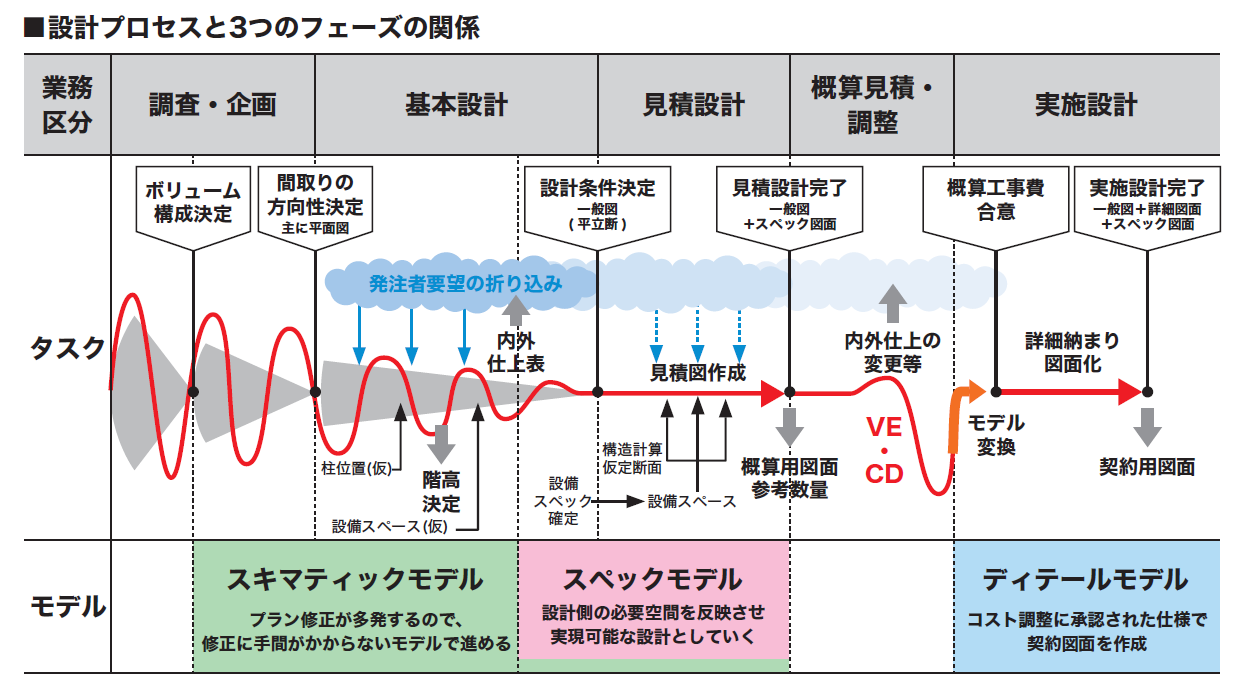 具体的には、基本設計段階で、一般図(平面・立面・断面)と3次元パース及び面積表が揃った段階で、プロジェクト関係者が意見を出し合って計画を改善するサイクルを何度も繰り返し、課題の発見と解決の前倒しをする。そのサイクルを可能にするのがスキマティックモデル、スペックモデル、ディテールモデルへと順を追ったモデルの作成と、集計表やDynamoを用いた情報入力の自動化である。従来のフロントローディングの考え方とは逆に、モデルの詳細度をなるべく低く保っておくことで変更容易性を高めることができる。
