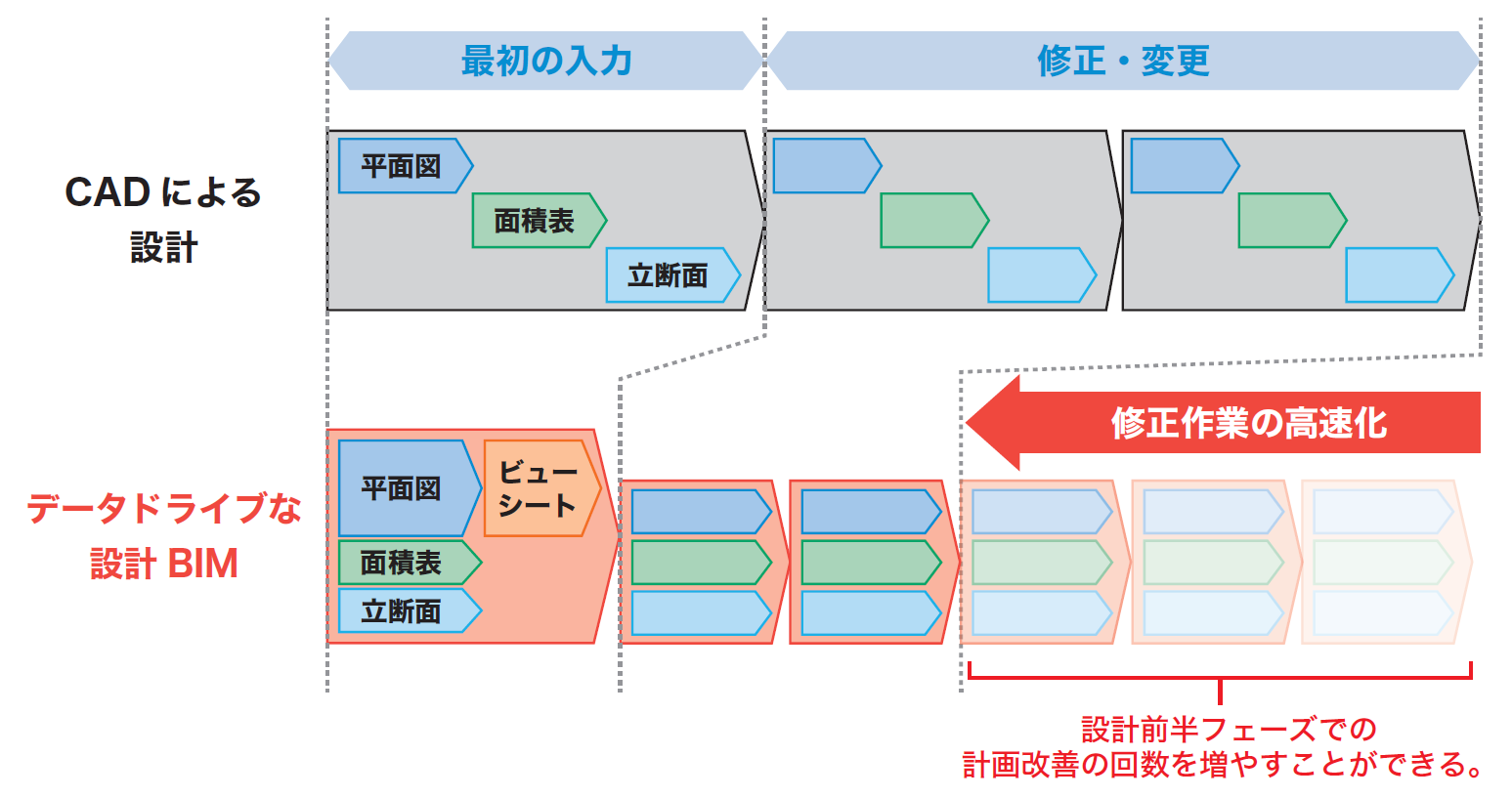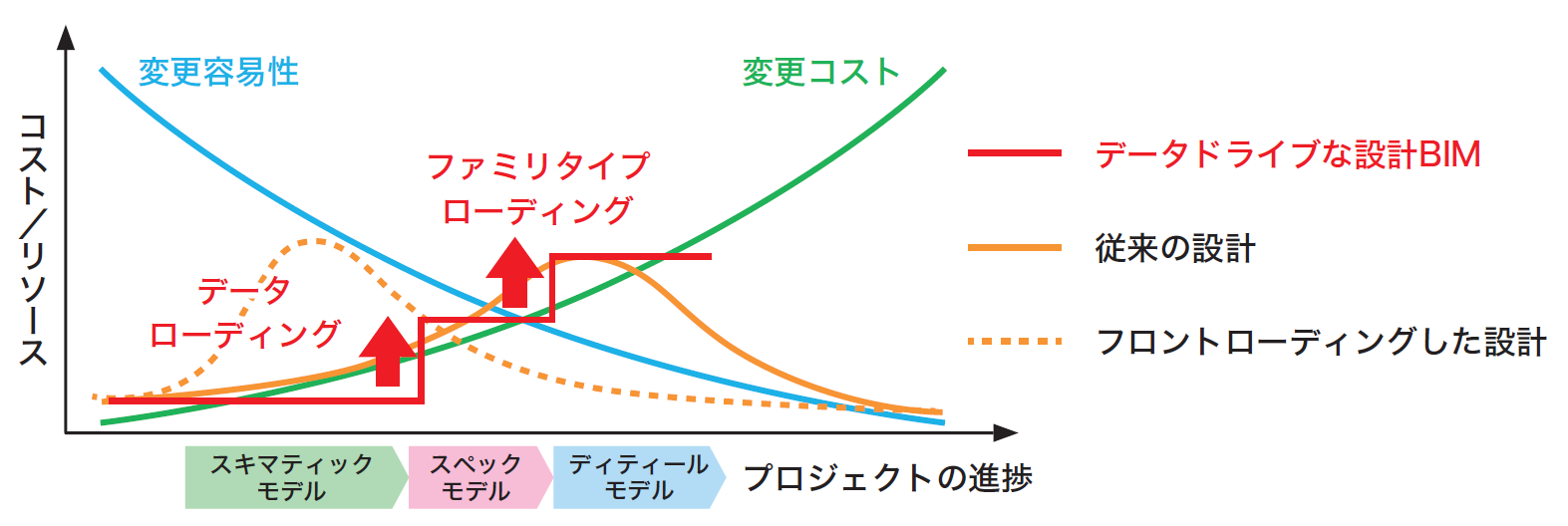 それによって2次元CADによる設計手法と比較して設計前半での検証回数を圧倒的に増やすことができる。その結果、課題解決の前倒し、すなわち正しいフロントローディングを可能とし、実施設計や施工段階での変更が少なく、一段と生産性の高い設計プロセスを実現できる。