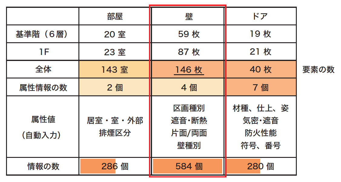 例えば壁種別を決めるには、区画性能・遮音断熱性能・片面/両面施工といった複数の属性情報(区画種別、遮音・断熱、片面/両面)を多数の壁要素に対して決めておく必要がある。それらの属性情報を人手で入力する際には、平面図で壁を一つずつ選びながら入力していくことになる。手間がかかると共に、ミスも発生しやすい。