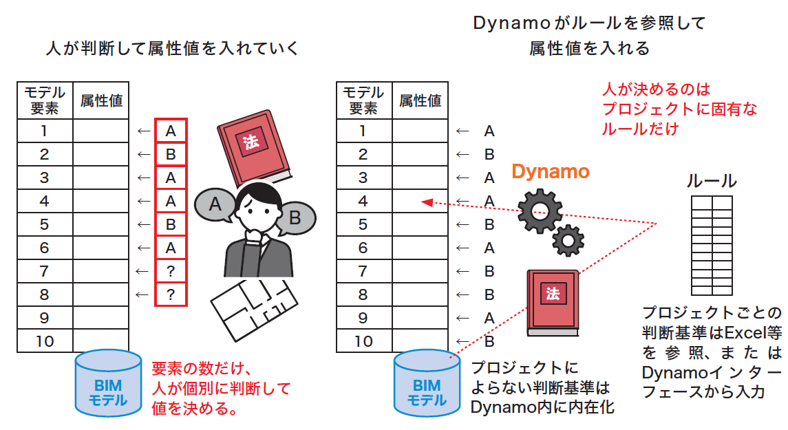 人手で一つずつ判断して属性情報(値)を入力する際には、要素の数だけ判断を繰り返す必要があるが、Dynamoによる自動化では、人が決めるのは、プロジェクトに固有な「ルール」のみであり、属性情報(値)入力の手間は省け、ミスを激減できるわけだ。設計者主体で設計者のために書き下ろされた本書の核心がここにある。