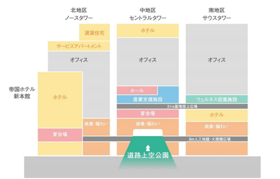 具体的には、帝国ホテル東京のノースタワー、セントラルタワー、サウスタワー、新本館を建設するもので、日比谷公園とつながる道路上公園を整備し、エリアの回遊性を向上させる計画です。今回の帝国ホテル東京 新本館の建て替えは、そのうちの「新本館建設」に当たります。