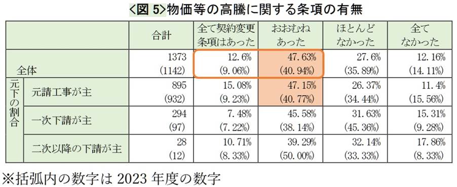価格転嫁ルールを認知している企業は全体の約60パーセントに達しましたが、小規模企業では37.6パーセントにとどまっています。契約変更条項のある請負契約は60.23パーセントとなり、前年より10.23ポイント増加しました。価格変動を受けて契約変更の協議を実施した企業は約40パーセントでしたが、すべての契約で変更に至ったのは約20パーセントに留まりました。
