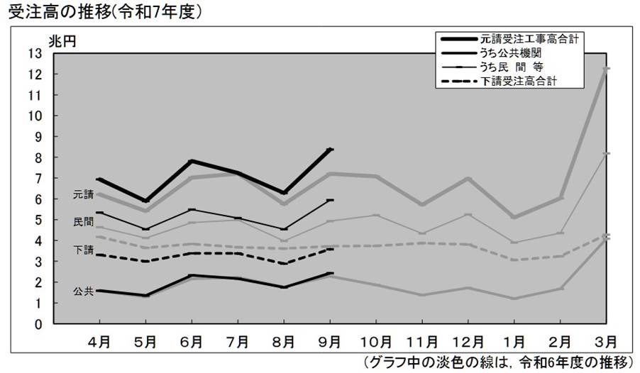 国土交通省リリース,建設工事受注動態統計調査報告(令和 7 年 9 月分)について,https://www.mlit.go.jp/report/press/content/kakuho2509.pdf