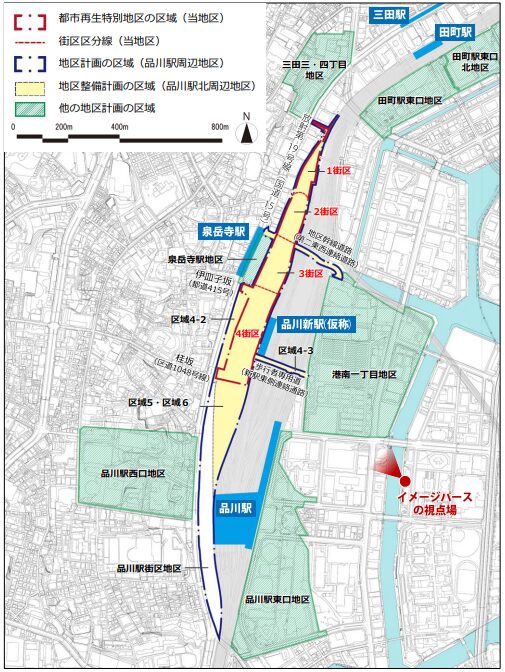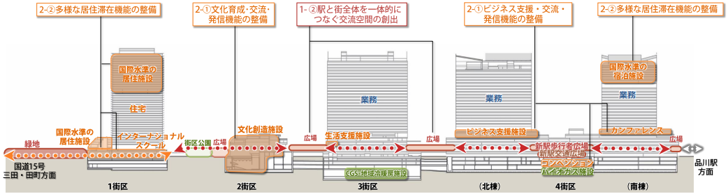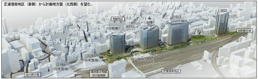 北側の1街区からは三田・田町方面、南側の4街区からは高輪地区とつながる基盤が整備されます。
