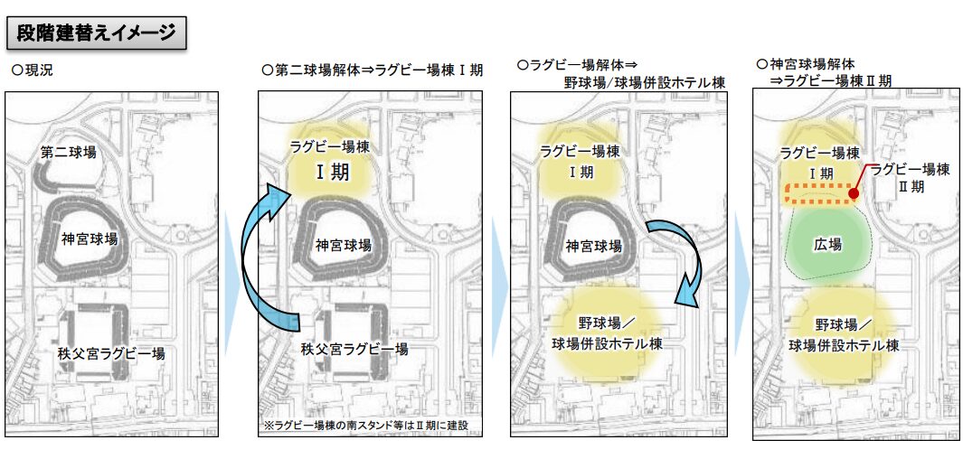 神宮第2球場やラグビー場が使えなくなる期間をできる限り短くするため、それぞれの位置を入れ替えながら順番に建て替えられます。