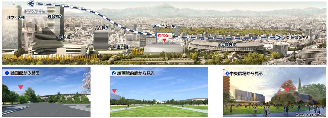 従来の秩父宮ラグビー場の最高高さは55mでした。しかし周辺主要ポイントからの景観に配慮するため、建て替え後は「約48m」に抑えられる予定です。これにより、青山通りへと続く地区全体のスカイラインと調和した計画とします。