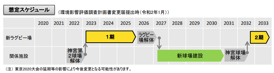 秩父宮ラグビー場の建て替えは、東京都のまちづくり指針に基づき、第1期工事(フィールドと3面のスタンド)と第2期工事(南側のスタンド)に分けて整備されます。具体的な工期は、下表の通りです。