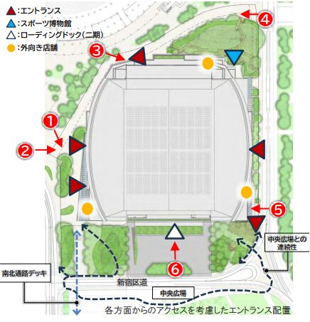 秩父宮ラグビー場の建て替えではエントランスが東西南北に設けられる予定で、人々がどこからでもアクセス可能な開かれた計画となっています。