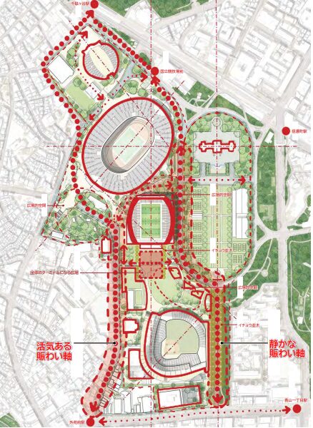 神宮内苑を囲む外苑は、元々「大衆の屋外レクリエーションのための広大な景園地」として建設されました。そのため今回の建て替え計画でも、競技施設を周回道路の外側にまとめるゾーニングによって、記念施設と競技施設を違和感なく共存させています。