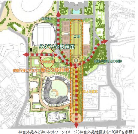 秩父宮ラグビー場の建て替えに関する一連のプロジェクトを通じて、神宮外苑のみどりを未来につなげる取り組みも実施されています。具体的には4 列のいちょう並木は伐採せずに保全し、さらに樹木本数は1904本から2304本に、みどりの割合は約25%から約30% に増加する計画です。