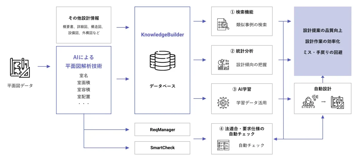 AIが解析・構造化したデータは「KnowledgeBuilder」に蓄積され、設計事例の検索や設計傾向の把握、AIによる学習・自動設計に活用される。更に加えて、「ReqManager 」や「SmartCheck 」では要件管理・基準チェックに利用でき、「Tektome Platform」全体で高度な連携が可能になる。