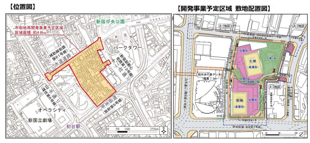 本プロジェクトはJR「新宿」駅と京王新線「初台」駅の間に位置し、緑豊かな「新宿中央公園」、高層ビルが建ち並ぶ「新宿西口エリア」、「新国立劇場」などの文化施設、住居系の市街地が広がる区域を対象とする再開発事業です。