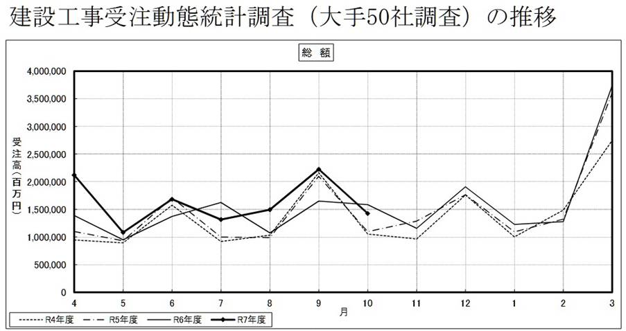 国土交通省リリース,建 設 工 事 受 注 動 態 統 計 調 査 報 告 ( 大 手 50 社 調 査 )( 令 和 7 年 10 月 分 ) に つ い て,https://www.mlit.go.jp/report/press/content/001969722.pdf