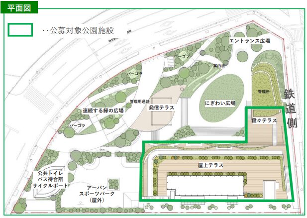 公園空間は、アーバンスポーツパーク、発信テラス、にぎわい広場の3つのエリアで構成されています。これらのエリアは商業施設の周囲に配置され、公園利用と商業利用の動線が重なる構成です。各エリアは、スポーツ利用や滞在、イベントなど、多様な使われ方を想定して計画されています。