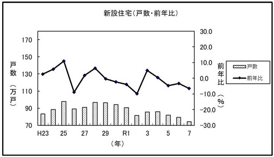 住宅建設の動向も厳しい状況が続いています。新設住宅の戸数は74万667戸となり、前年比6.5%の減少となりました。