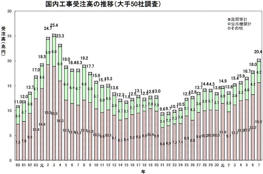 国土交通省発表、令和7年の大手50社国内建設工事受注額20兆3660億円で5年連続増
