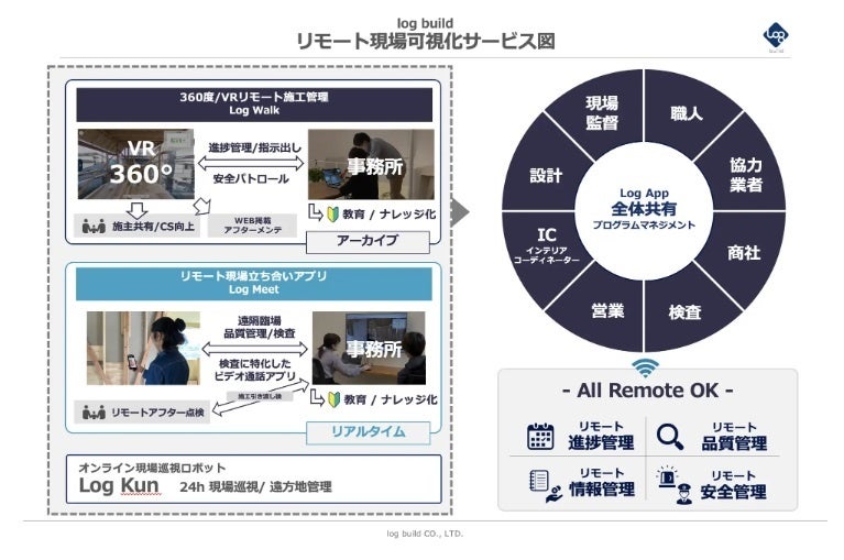 全国のゼネコン、ハウスメーカー、工務店、リフォーム、リノベーションなど幅広い領域でリモート施工管理を実現するためのサービス「Log System(ログシステム)」を開発する建設テックの(株)log buildは、湘南の建設会社である(株)ecomo※1のVR・AI・ロボット事業部として発足し、2020年2月に創業。2021年11月には、プレシリーズAラウンドとなる総額約1億円の資金調達を実施。