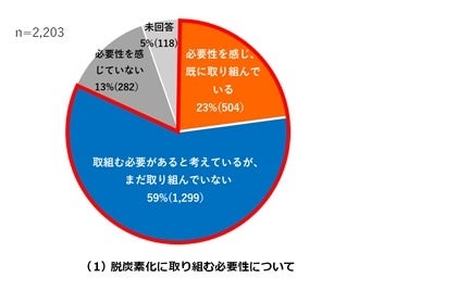 脱炭素化に「必要性を感じ、既に取り組んでいる」「取り組む必要があると考えているが、まだ取り組んでいない」を合わせると、約8割(82%)が前向きに「取り組む必要がある」という結果でした。一方、実行面では「取り組む必要があると考えているが、まだ取り組んでいない」と回答した事業者が全体の約6割(59%)であることが確認されました。