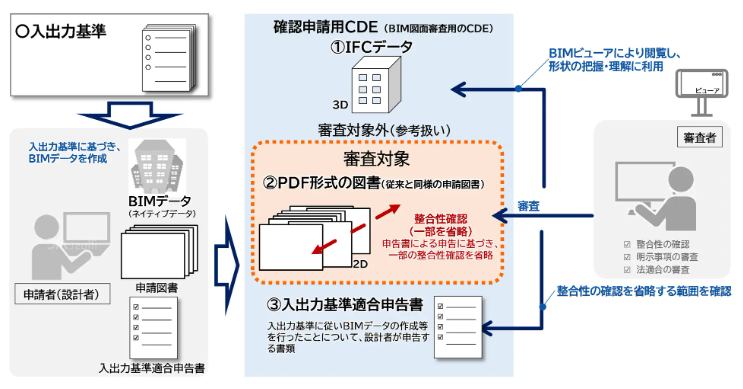 「BIM図面審査」とは、BIMによって作成されたPDF形式の申請図書を確認申請用CDE(Common Data Environment:共通データ環境)を使用して申請、審査する新たな電子申請方式を指す。CDEのクラウド環境を活用することによって申請者と審査者が申請図書を共有し、必要に応じてIFC形式のBIMデータ(3次元モデル)も参照する。