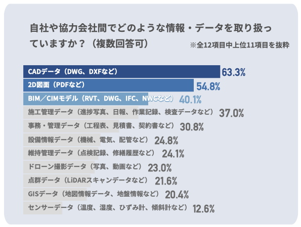 現状では、従来の2次元図面・CADデータがいぜんとして大きな割合を占めている。一方で、BIM/CIMモデルや施工管理データなども一定の割合で活用されており、 約半数弱のプロジェクトで何らかの3次元モデルや管理情報が共有されている。ただし、BIM/CIMが前提となるプロジェクトとそうでないプロジェクトが混在している状況で、発注者要件やプロジェクト規模によってデータ形式の選択にばらつきが生じている。