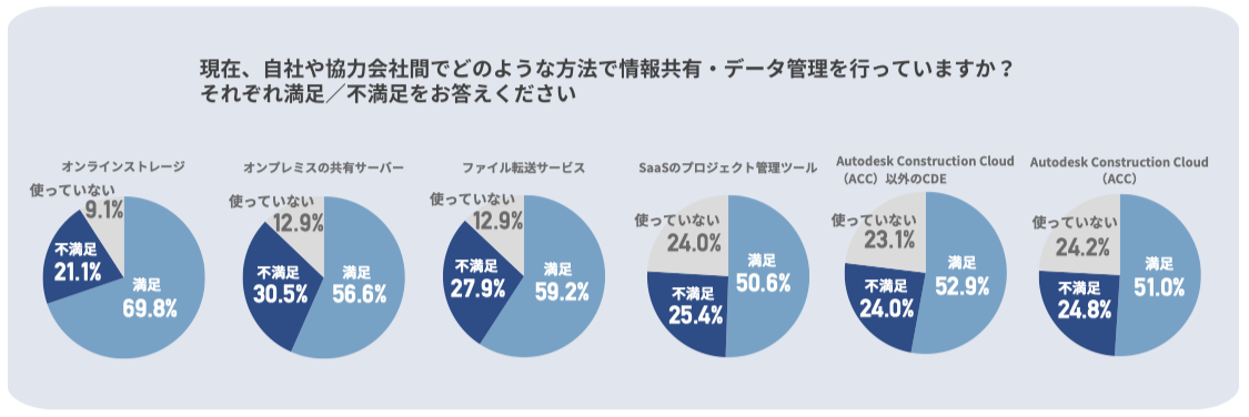 応用技術が行った「建設現場における情報共有・データ管理の実態」調査からは、「データ管理・共有ツールに対する満⾜度」において、クラウド型のオンラインストレージについて利用者の過半数以上が満足していることがわかる。一方で、図面・3次元モデル・写真・点群・センサーデータなどが散逸的に管理されているため、それら多様なデータ形式を跨いで横断的に一元管理するCDEへの期待が大きいことも判明した。