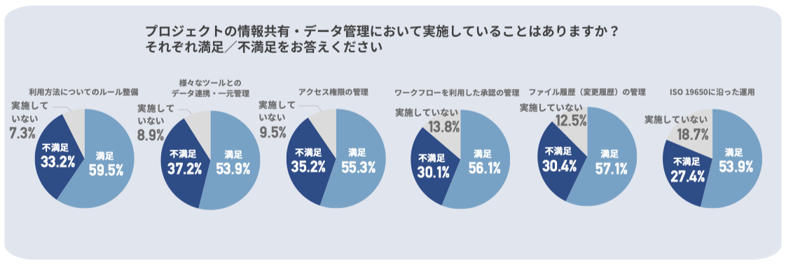 「データ管理・共有ツールに対する満⾜度」では、クラウド型のオンラインストレージについて利用者の過半数以上が満足している結果となっており、最も評価の高い運用手段といえる。SaaS型のプロジェクト管理ツールやCDEについては、満足との声も一定数あるものの「使っていない」との回答も約2〜3割程度見られた。特定のツールが導入されているプロジェクトと従来型の共有方法にとどまるプロジェクトが混在している現状を反映している。