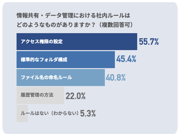 「情報管理のためのルール実態」については、基礎的な情報管理ルールが整備されていない企業が半数近く存在していることがわかった。具体的には、「アクセス権限の設定」「標準的なフォルダ構成」「ファイル名の命名ルール」などの基本的な情報管理ルールについても、半数近くの企業で規定されていない可能性があることが明らかとなった。このような基本的な情報管理ルールの未整備は、業務の効率化に大きな支障をきたす。アクセス権限が適切に設定されていない場合、重要なデータへの不正アクセスや誤操作が発生するリスクが高まり、情報漏洩やデータの破損に繋がる恐れがあるし、データが整理されず、必要な情報を素早く探し出せないなど業務の非効率が生まれる。