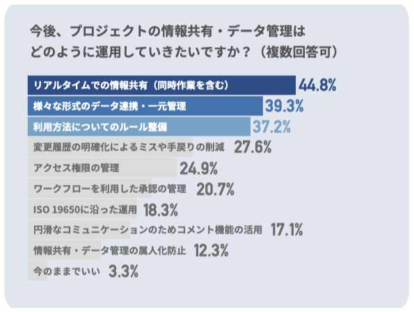 「今後の情報管理のニーズ」について聞いた処、リアルタイムでの情報共有ニーズの高まりが見られ、多様なデータ形式を跨いだ一元管理への期待も寄せられている。現場では即時対応や迅速な意思決定が求められている。プロジェクトの進行中にタイムリーで正確な情報を共有することで問題の早期発見と対応が可能となり、全体の効率化が進む。リアルタイム共有の実現には、クラウド技術を活用することが不可欠である。「様々な形式のデータ連携・一元管理」も上位に挙げられており、図面・3次元モデル・写真・点群・センサーデータなどが散逸的に管理されている現状からの脱却が求められている。運用ルールの整備やデータ共有の一貫性を高めることで情報管理の質も向上する。変更履歴の管理やアクセス権限の設定など透明性と整合性のある運用体制を築くことがプロジェクト全体の進行を円滑にし、リスクを最小化するために重要である。