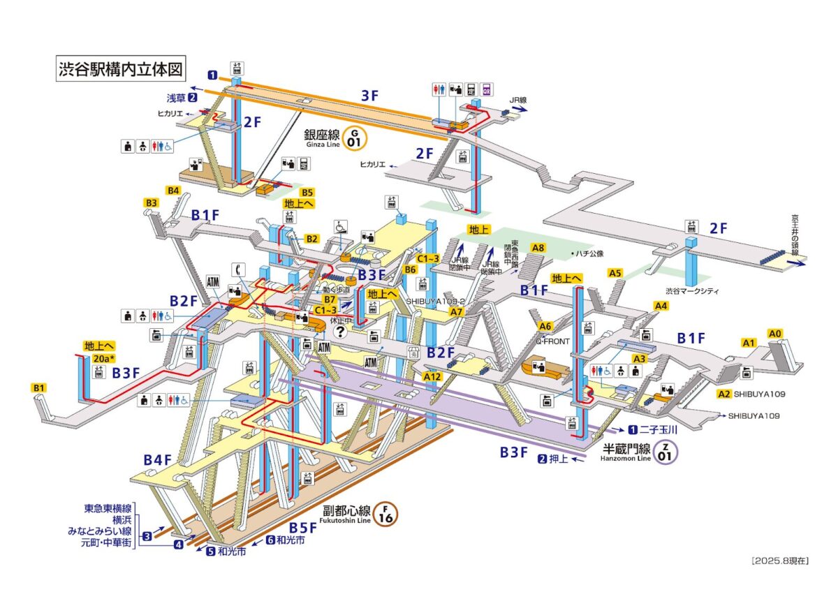 渋谷駅は複数の鉄道会社が集まる巨大ターミナルであり、銀座線は他路線と階層が大きく離れています。とくに地下深い半蔵門線・副都心線や東急線からの乗り換えは上下移動が多く、混雑時は想定以上に時間がかかる場合があります。