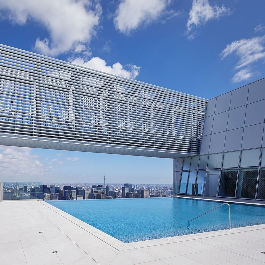 ステーションタワーの最上階49Fには、屋上プール「インフィニティプール」が設けられています。地上250mの屋外に設置されており、柵や窓がないため、まるで空と水面がつながっているような絶景が広がります。