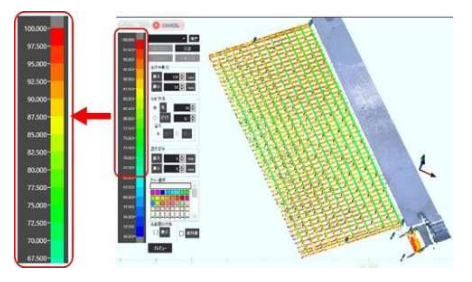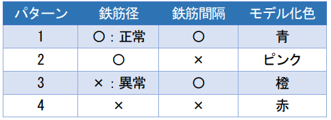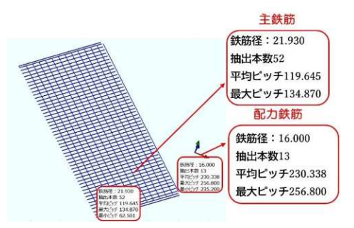 鉄筋径及び間隔については、モデル作成時に入力した設計値・規格値を参照し、規格値から外れたものは着色表示する。かぶり厚さについては、設計面との差をカラーマップで可視化する。これによって配筋全体の出来形を視覚的かつ直感的に把握することが可能となる。