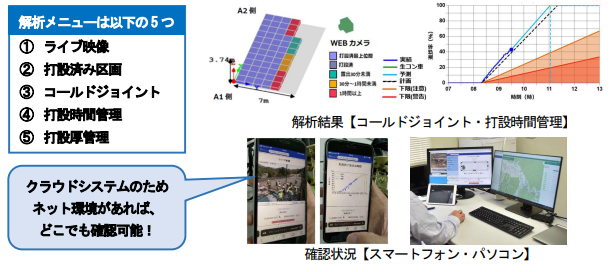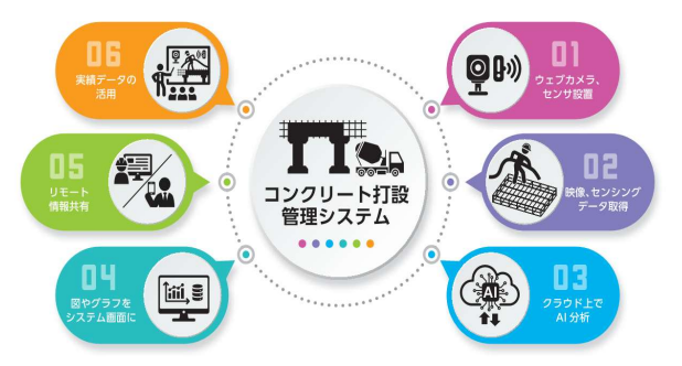 当該システムは、熟練監督所員の減少や若年社員の経験不足による品質トラブルを未然に防ぐことを目的に開発された。現場に設置したWEB カメラや各種センサーによって作業状況を記録し、クラウド上の管理システムによって取得データのAI分析を実施する。