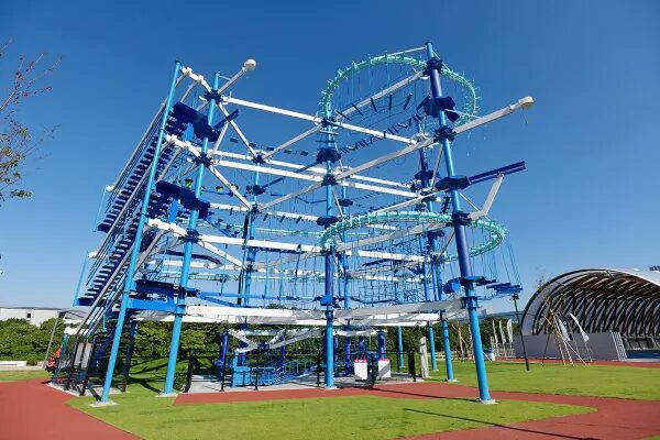 綱渡りや丸太渡り、縄ばしごなど、全52種類のアスレチックを空中で楽しめる大型遊具です。高さ約15mの立体コースでスリル満点。最大約12mまで登れる「おとなゾーン」と、地上から見守れる「こどもゾーン」に分かれており、幅広い年齢で楽しめます。