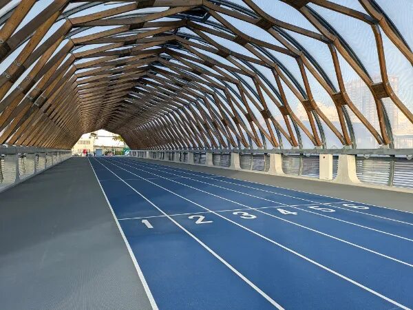 全長約100mのトンネル型施設内に、90mのランニングトラック(6レーン)を備えた全天候型の練習場です。雨の日でも快適に走れるほか、車椅子でも利用できるバリアフリー設計が特徴です。