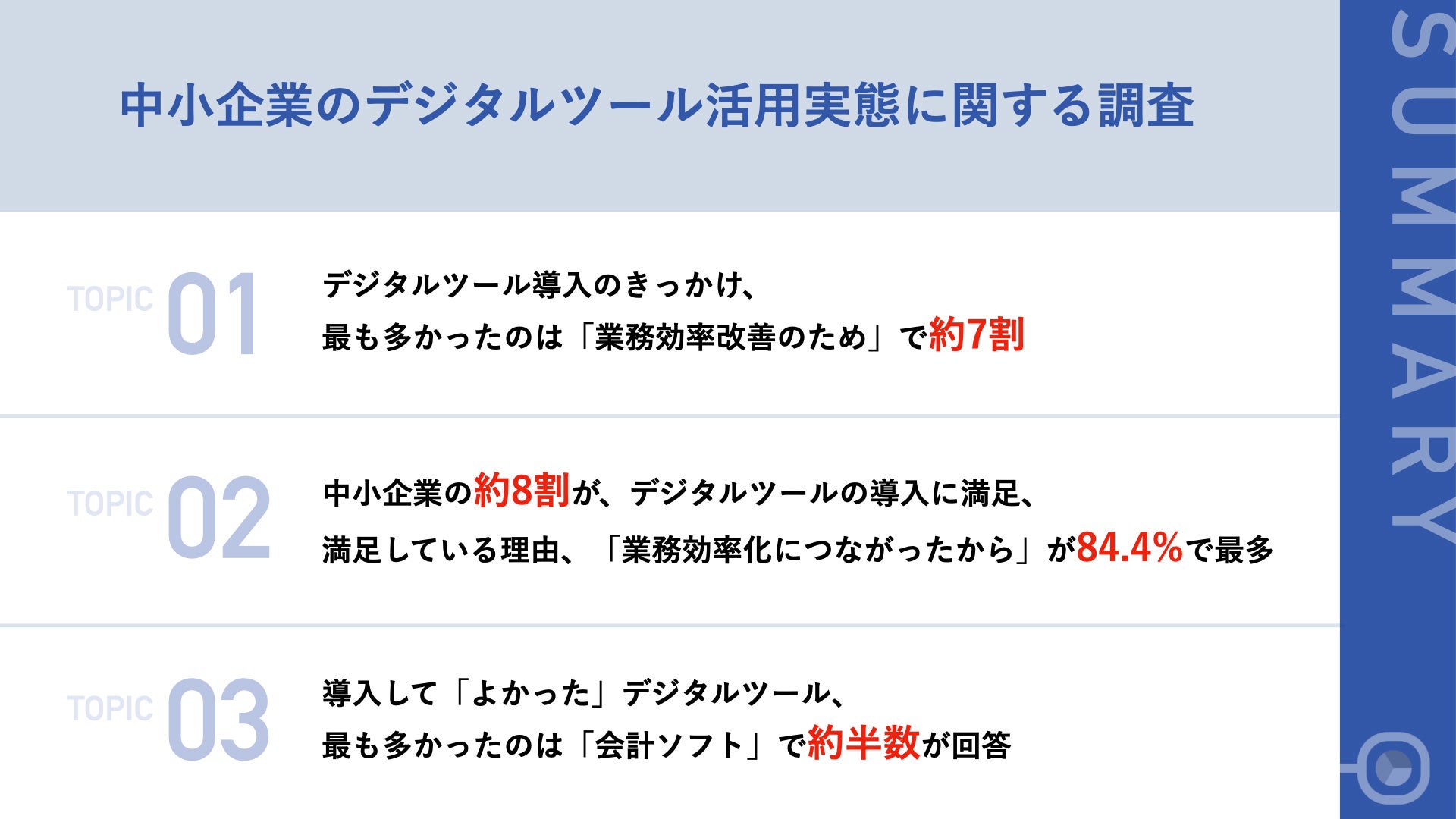 - 中小企業経営者の約8割が、デジタルツールの導入に満足