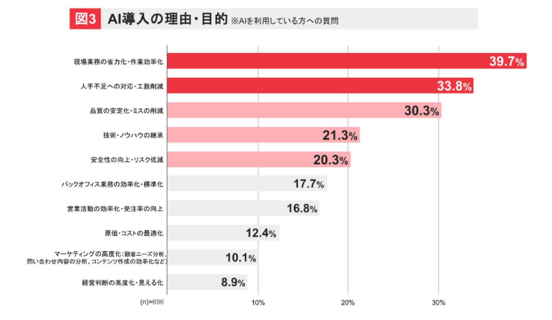 AI導入の目的は、「省力化・作業効率化」39.7%、「人手不足への対応」33.8%となるなど業務効率化が最多であり、次いで「品質の安定化・ミス削減」30.3%、「技術・ノウハウの継承」21.3%、「安全性の向上・リスク低減」20.3%などとなっており、「安定した施工品質」への指向も重要視されている。