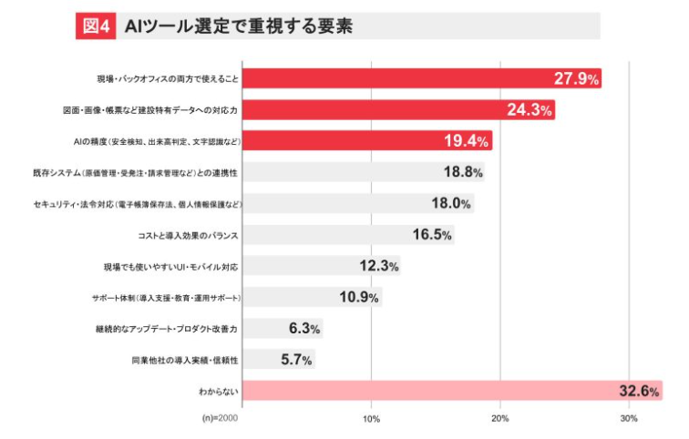 AI導入に際して重要視する要素は、「現場と事務の両方で使える汎用性」が27.9%と最も多く、「図面・画像・帳票など建設特有データへの対応力」24.3%、「既存システムとの連携性」19.4%と続く。一方、「わからない」との回答も32.6%に上り、具体的な選定基準に迷う層の多さも浮き彫りとなった。