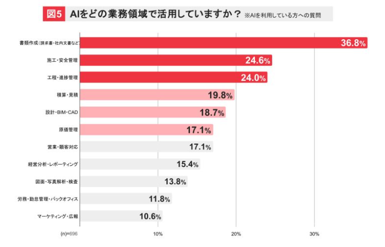 AIを活用している業務領域については、「書類作成」が36.8%と最も多く、「施工・安全管理」24.6%、「工程・進捗管理」24%といった建設特有の領域での活用が進んでいる。積算、設計、原価管理の領域でも約2割となっており、現場からバックオフィスまで様々な領域でのAI活用が始まっている。