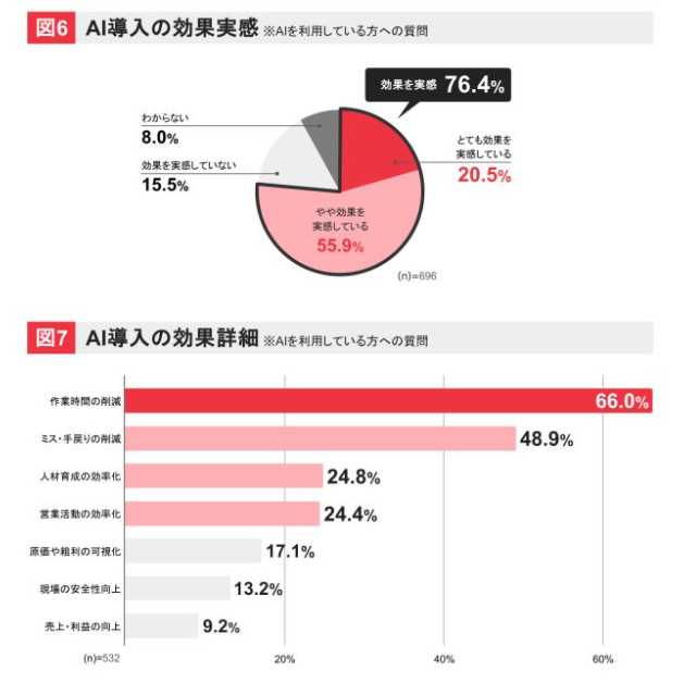 AI導入の効果については、AIを活用している者の内、76.4%が「効果を実感している」と回答しており、導入効果として「作業時間の削減」に関しては66%が実感している。次いで「ミス・手戻りの削減」48.9%、「人材育成」24.8%の者が効果を実感している。