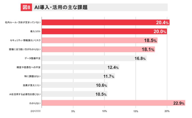 AI導入・活用における課題については、「社内ルールの未整備」20.4%、「導入コスト」20%が上位となった。一方で「わからない」22.9%という回答が最上位となり、AIの活用イメージが沸きにくい層が多いこともわかった。