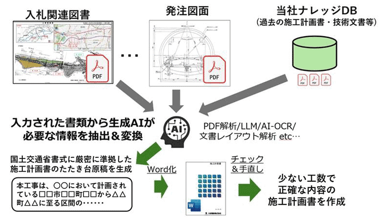 入札公告・工事概要・特記仕様書などの発注情報と、受注に際して作成・蓄積した技術提案などの社内ナレッジを入力することによってAIの文書解析機能により全体施工計画書作成に必要な情報を抽出する。これら抽出情報と社内で作成した施工計画書の記載事例を基にマルチモーダルAIが専門用語、文章、図表を適切に組み合わせ、約10分で施工計画書の原稿を自動生成する。