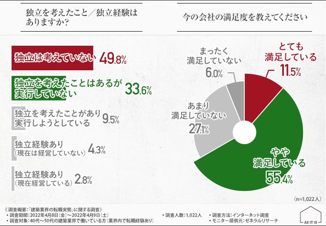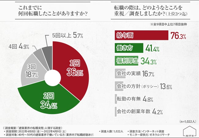 そこで今回、「あるがままに自由で豊かな暮らしを提供したい」つくば・渋谷・水戸の工務店『株式会社AS IT IS』(https://asitis.ibaraki.jp/)は、40代~50代の建築業界で働いている方(業界内で転職経験あり)を対象に、「建築業界の転職実態」に関する調査を実施しました。