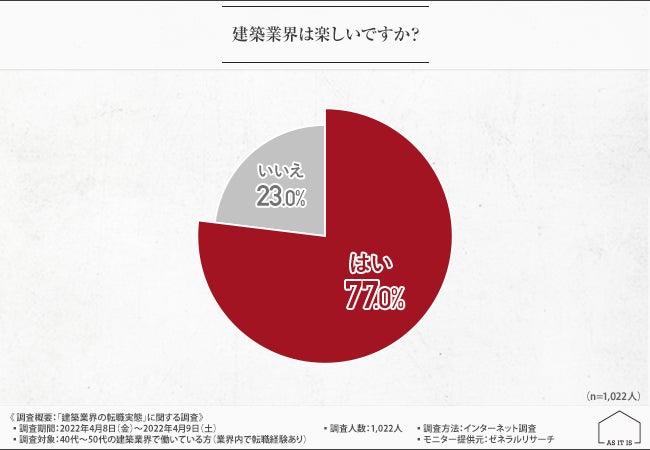 次に、「建築業界は楽しいですか?」と質問したところ、7割以上の方が『はい(77.0%)』と回答しました。