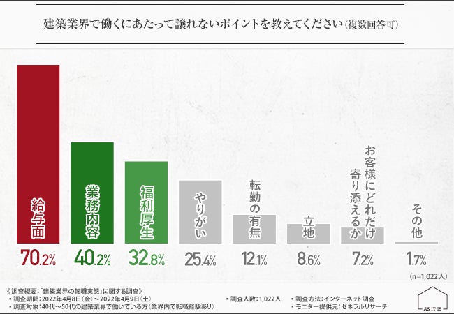 そこで、「建築業界で働くにあたって譲れないポイントを教えてください(複数回答可)」と質問したところ、『給与面(70.2%)』と回答した方が最も多く、次いで『業務内容(40.2%)』『福利厚生(32.8%)』と続きました。