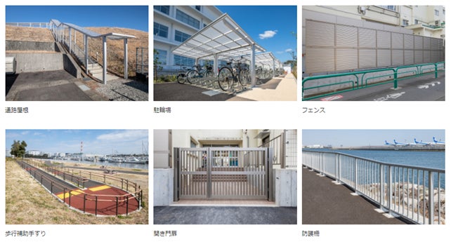 通路屋根や駐輪場、フェンス、歩行補助手すり、開き門扉、防護柵などさまざまな施工事例をご覧いただけます。