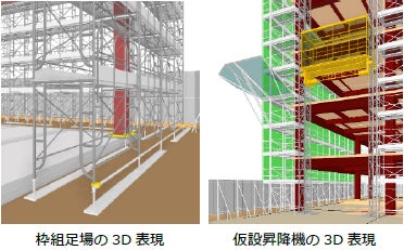 ・揚重運搬に利用される【仮設昇降機】に対応。機種に応じてカゴ・レール・台座を組み合わせて配置することで工程計画の4Dシミュレーションまで実現。