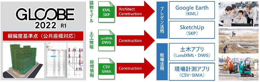 国土交通省では、建設現場の「生産性革命」「働き方改革」の実現に向けて、BIM/CIMの普及や3次元モデルとICTの全面活用を推進しています。【GLOOBE 2022 R1】では“普段使いのBIM”をテーマに、仮設計画/土工計画の機能拡充による生産設計の対応、ならびに公共座標やGoogle Earth連携などのオープンBIM対応を強化することで、“施工現場の見える化” による建設現場の生産性の向上に貢献します。