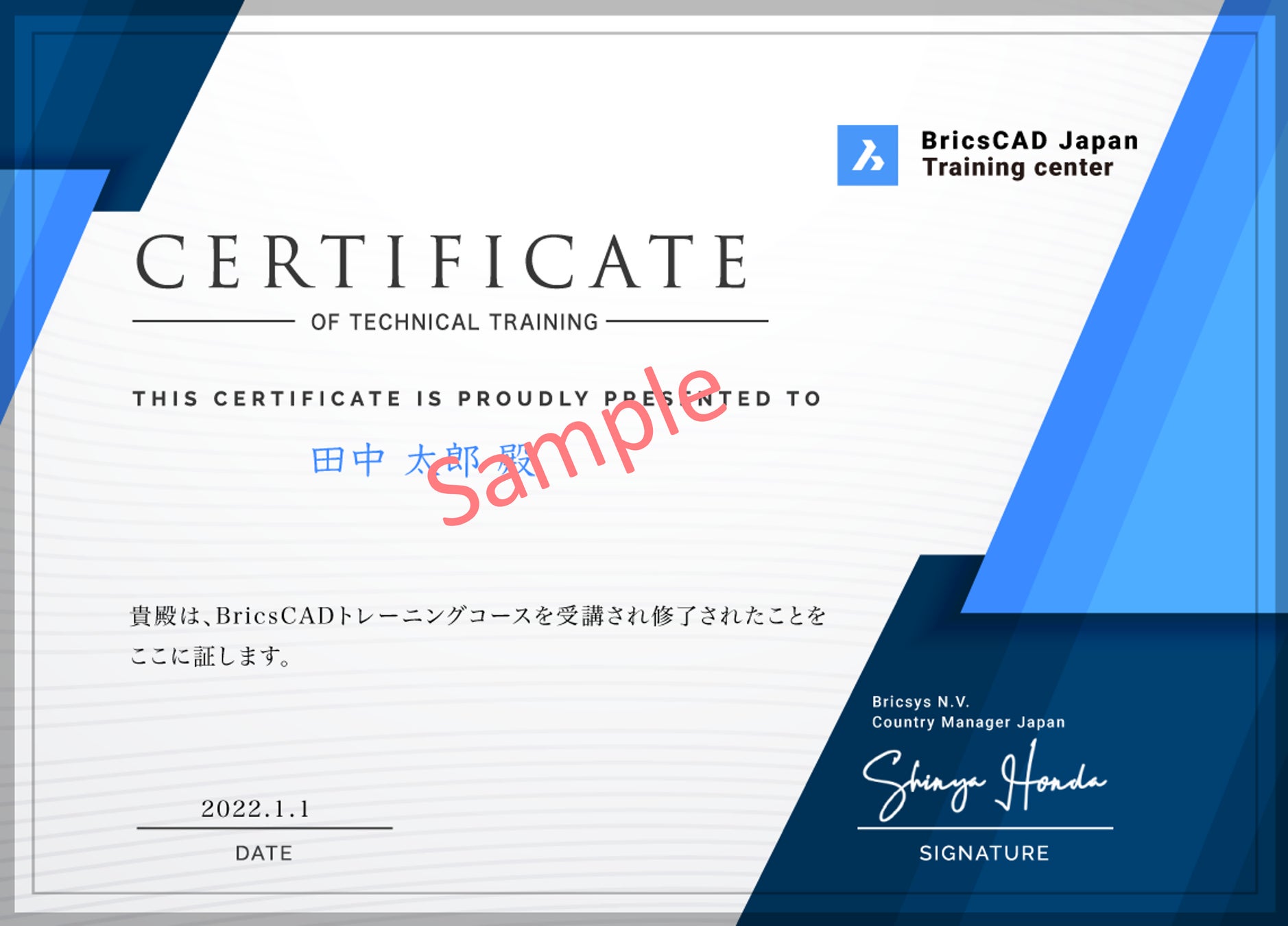 トレーニングセンターの認定はBricsys Japanによる、トレーニング受講内容とトレーニング環境の審査を経たうえで認定致します。 また、受講者には、Bricsys Japan認定の講座において規定のトレーニングの受講を完了された方に、修了証を授与致します。